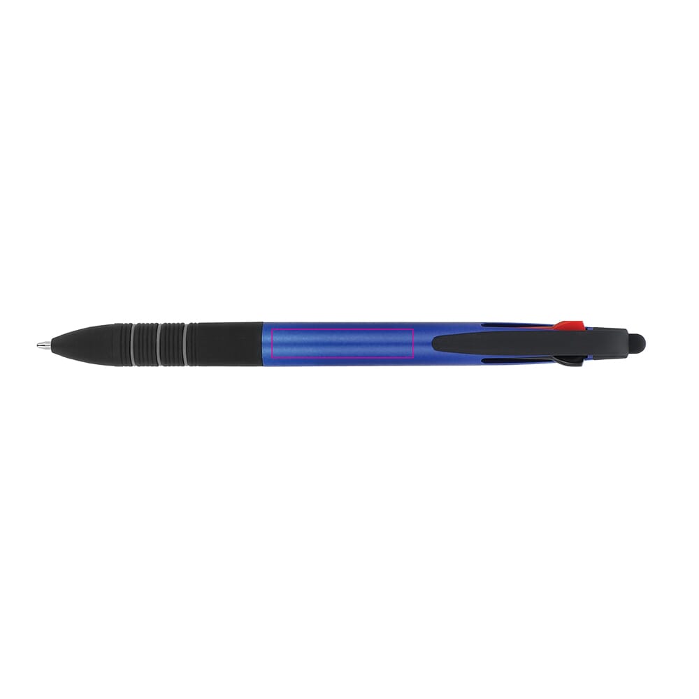 3-farbiger Metallic-Kugelschreiber mit Stylus und weichem Ergogriff. Die Schreibfarben sind Schwarz, Blau und Rot.