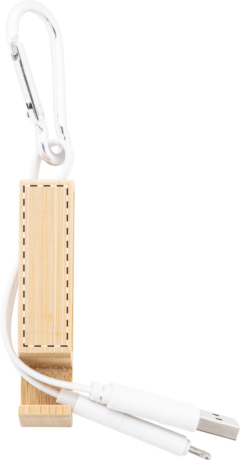 USB-Ladekabel mit Karabiner aus recyceltem Aluminium und Handyhalter aus Bambus. Mit Micro-USB-, USB-C- und Lightning-Anschlüssen. Mit USB- und USB-C-Eingängen.