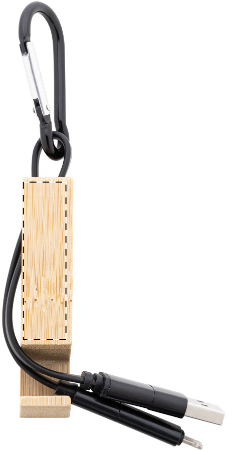 USB-Ladekabel mit Karabiner aus recyceltem Aluminium und Handyhalter aus Bambus. Mit Micro-USB-, USB-C- und Lightning-Anschlüssen. Mit USB- und USB-C-Eingängen.