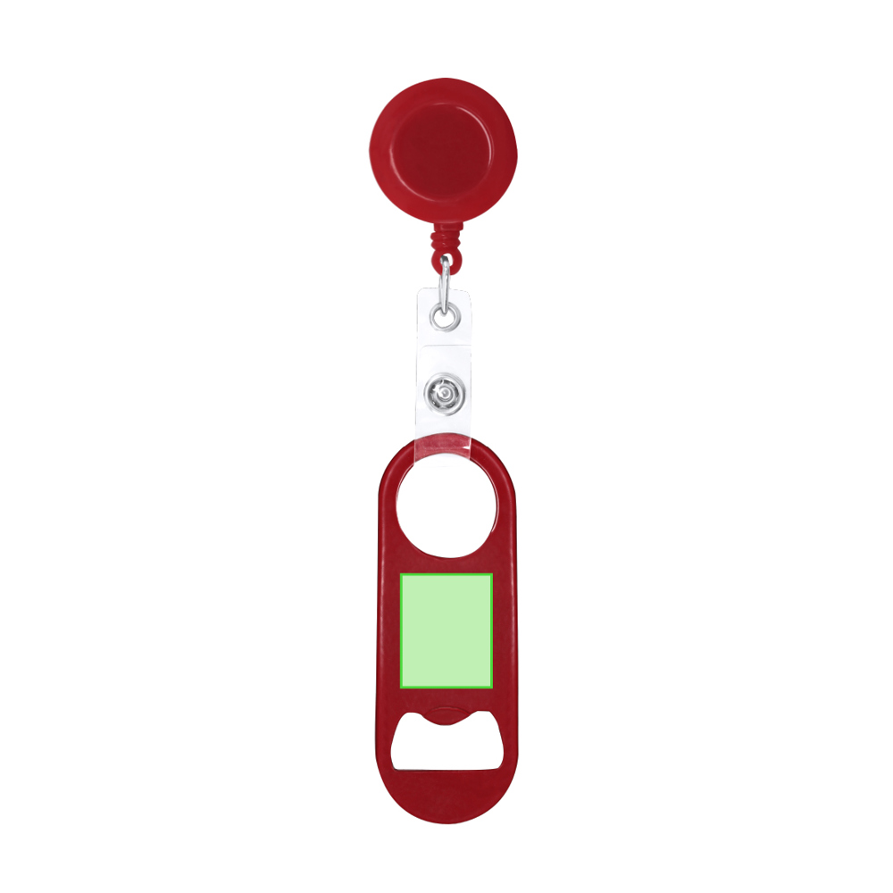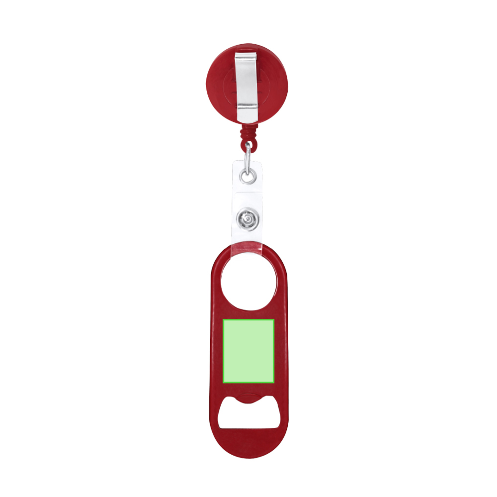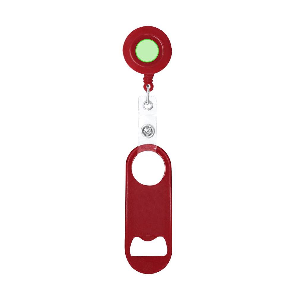 Stahlöffner mit glänzendem metallischem Finish. Ein Ende mit Flaschenöffner, am gegenüberliegenden Ende ein rundes Loch, das per Druckknopfverschluss an einen 65 cm langen, einziehbaren Halter mit Clip befestigt ist. Praktisch und funktional kann er aufgehängt werden, um Verluste zu vermeiden. Sein abnehmbarer Verschluss bietet die Möglichkeit, nur den Öffner zu verwenden oder ihn separat an einem Lanyard zu befestigen.