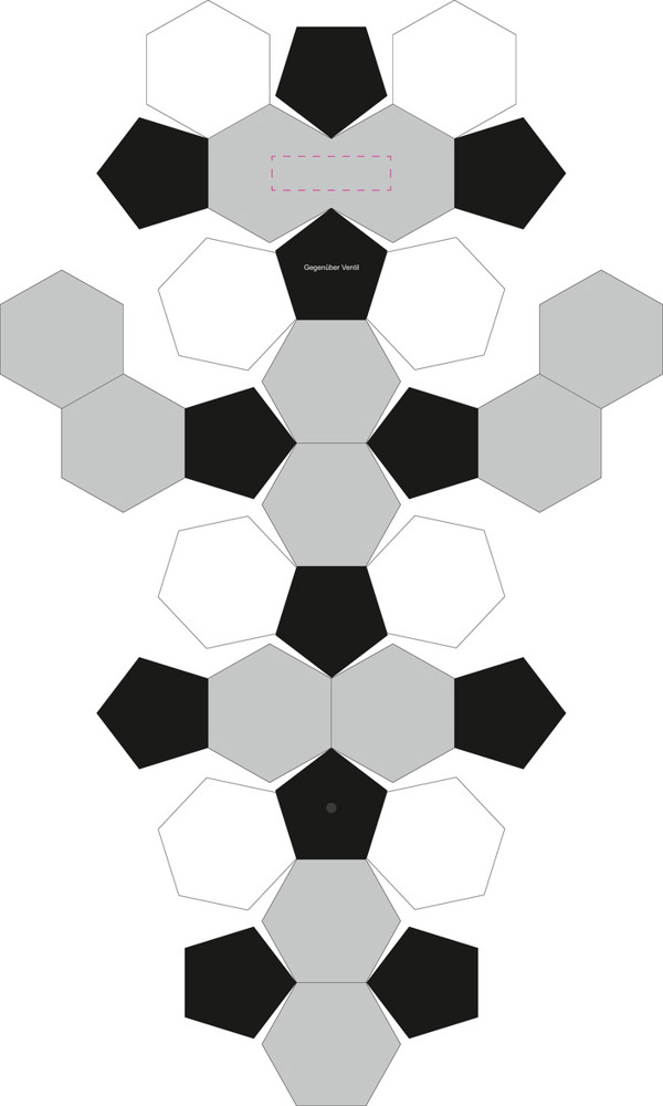 Ein Fußball der auffällt! Maschinell genähter Fußball aus PVC in den Farben weiß, schwarz und grau. Größe 5. Der Ball ist 3-lagig und hat 32 Panele inkl. einem Doppelpanel. Er verfügt über eine Dicke von 2,0 mm, ein Butyl-Ventil und eine Latex-Blase. Gewicht: 330-360 g.
