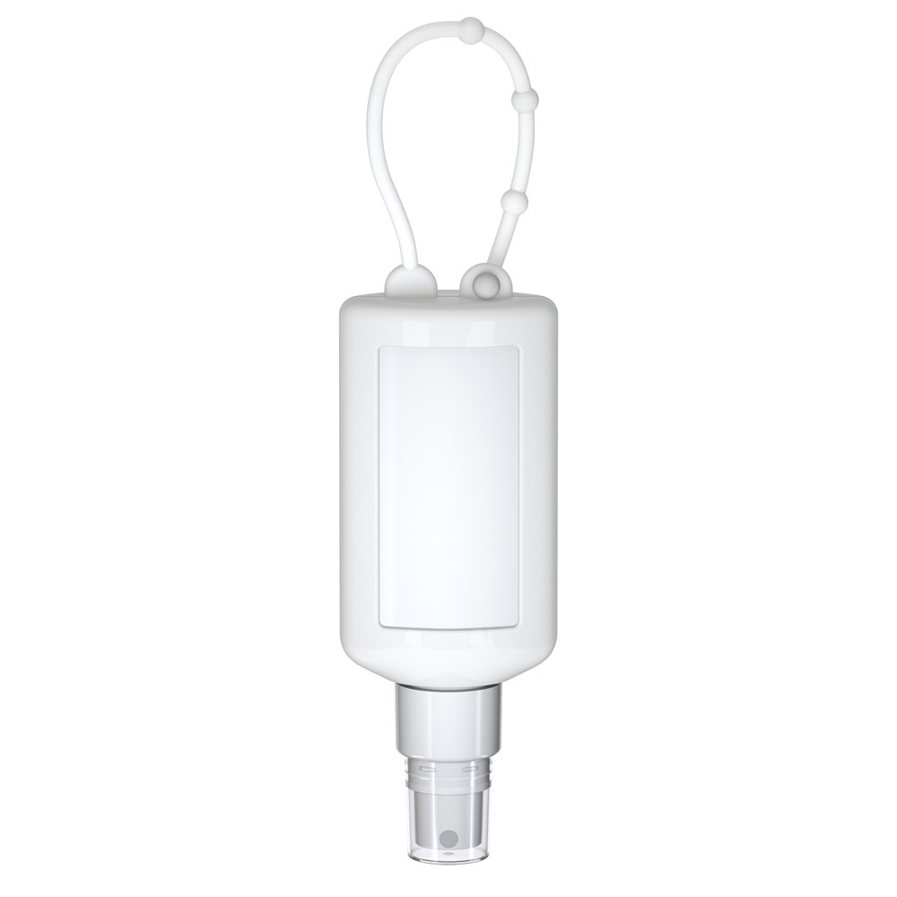 50 ml PET Flasche (weiß) mit weißem Pumpaufsatz und transparenter Schutzkappe; Silikonhülle und Schlaufe in frost. Nachfüllbar. Flasche hergestellt aus 100% recyceltem PET, weiß mit leichter R-PET-Färbung.