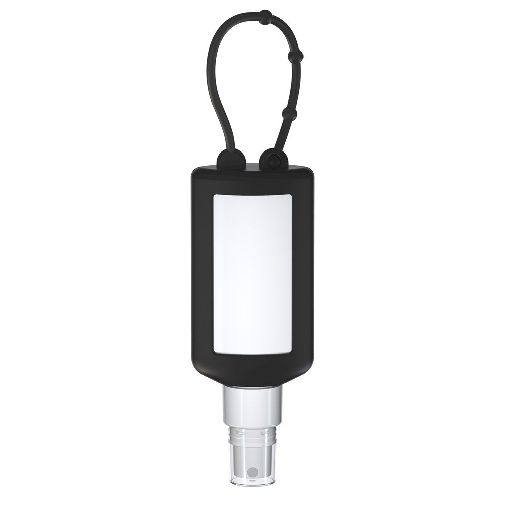 50 ml PET Flasche (weiß) mit weißem Pumpaufsatz und transparenter Schutzkappe; Silikonhülle und Schlaufe in schwarz. Nachfüllbar. Flasche hergestellt aus 100% recyceltem PET, weiß mit leichter R-PET-Färbung.